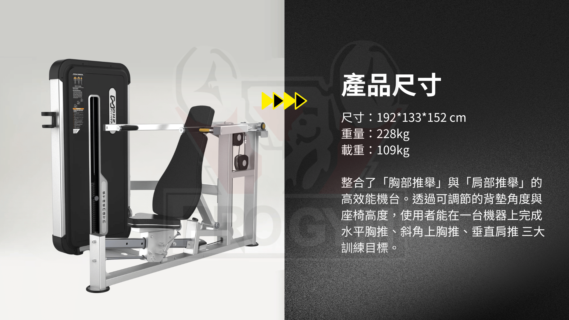 整合了「胸部推舉」與「肩部推舉」的高效能機台。透過可調節的背墊角度與座椅高度,使用者能在一台機器上完成 水平胸推、斜角上胸推、垂直肩推 三大訓練目標。