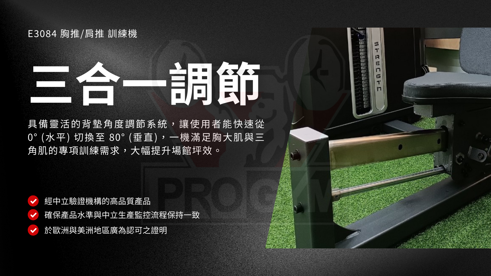 具備靈活的背墊角度調節系統,讓使用者能快速從 0° (水平) 切換至 80° (垂直),一機滿足胸大肌與三角肌的專項訓練需求,大幅提升場館坪效。