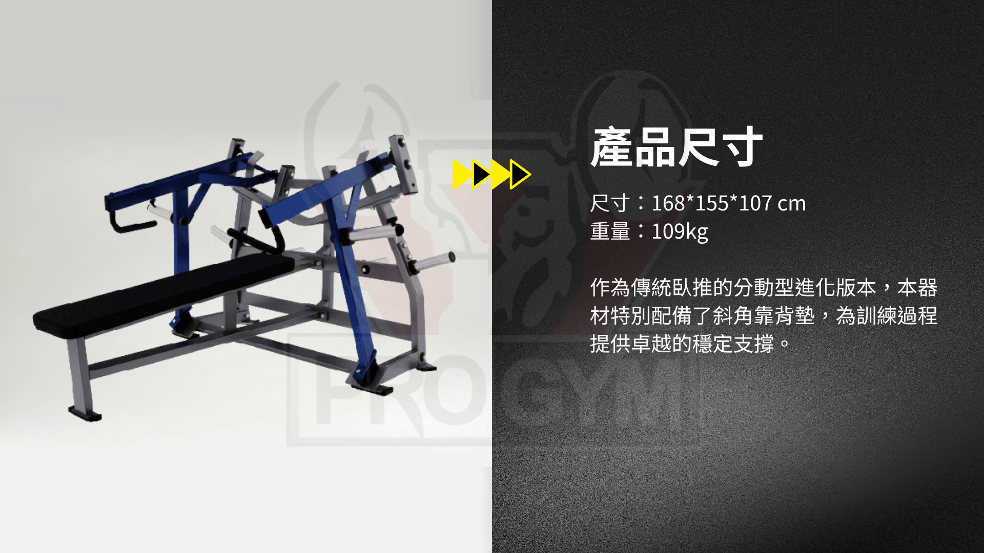 作為傳統臥推的分動型進化版本,本器材特別配備了斜角靠背墊,為訓練過程提供卓越的穩定支撐。