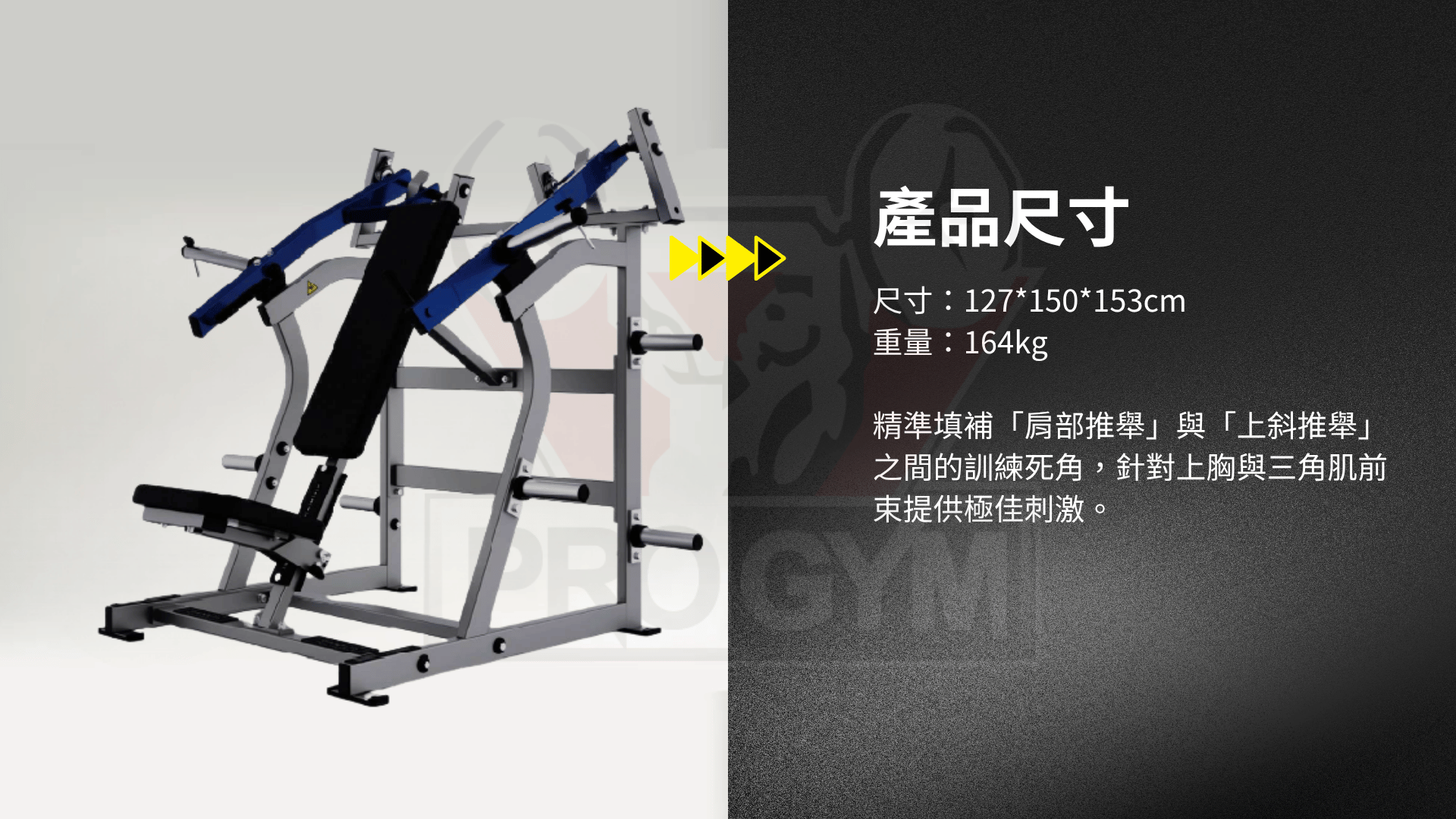 精準填補「肩部推舉」與「上斜推舉」之間的訓練死角,針對上胸與三角肌前束提供極佳刺激。