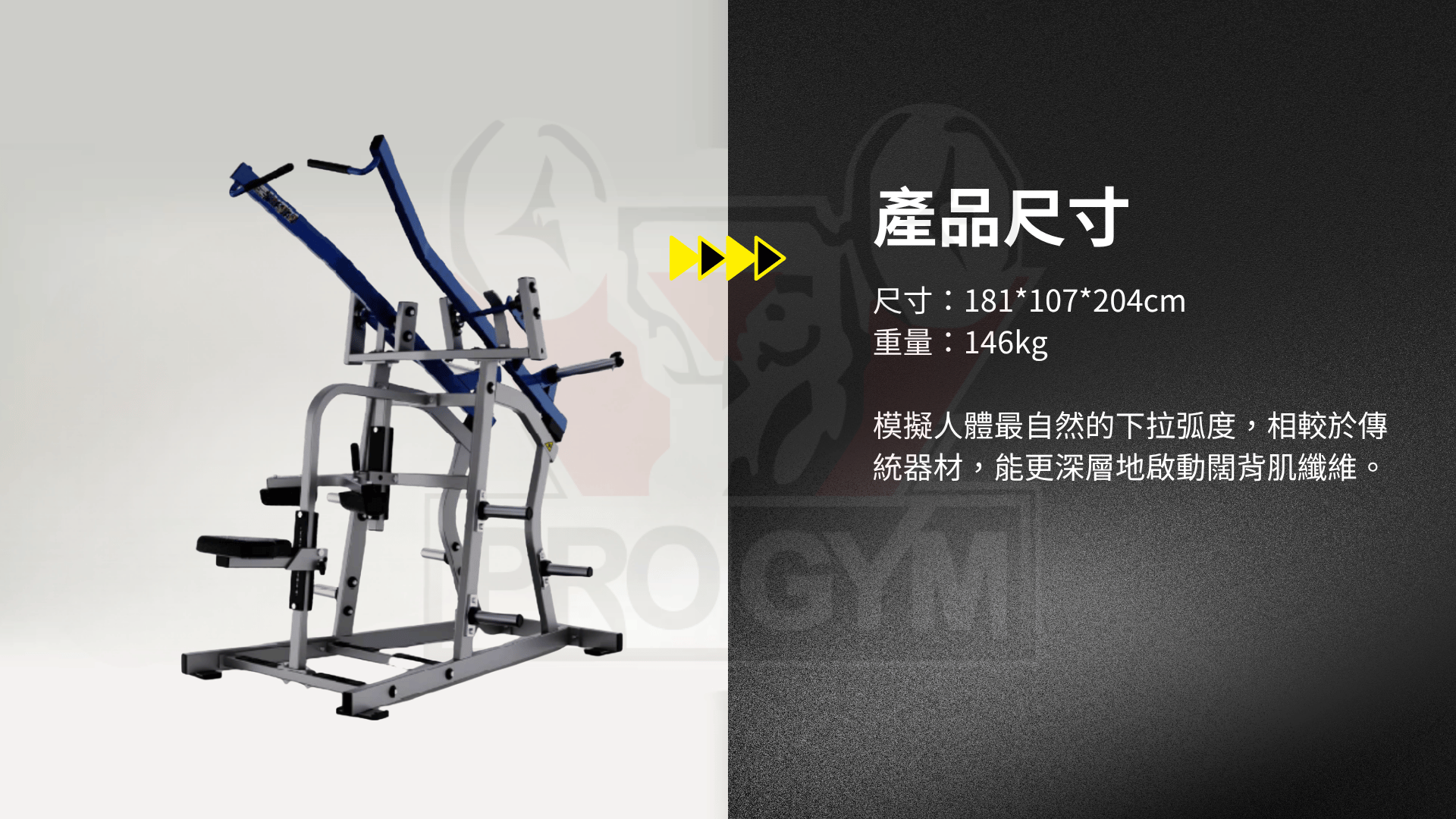 模擬人體最自然的下拉弧度,相較於傳統器材,能更深層地啟動闊背肌纖維。