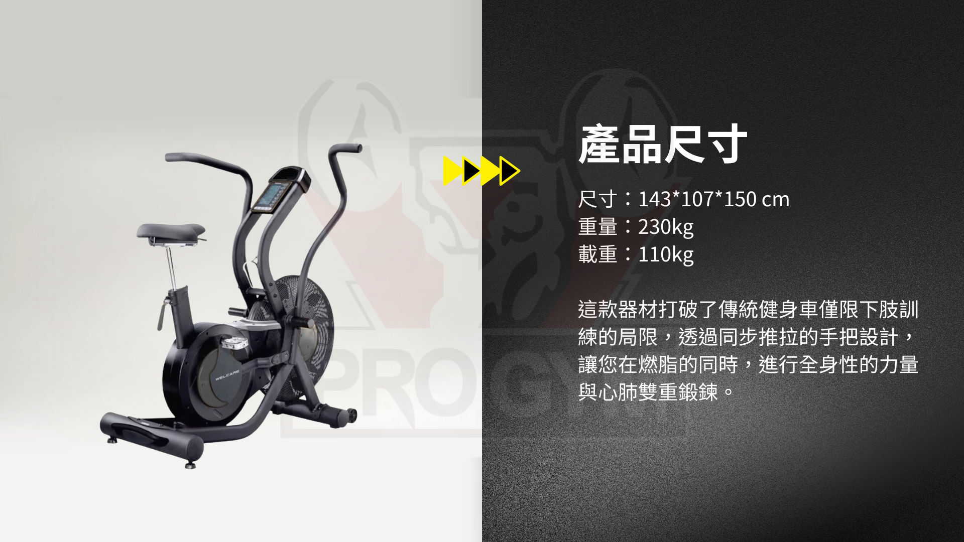 這款器材打破了傳統健身車僅限下肢訓練的局限,透過同步推拉的手把設計,讓您在燃脂的同時,進行全身性的力量與心肺雙重鍛鍊。