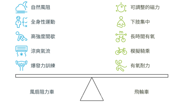 雖然風扇車與飛輪車都屬於有氧運動器材,但兩者在設計理念、運動模式與訓練效果上有明顯差異,左方圖片簡單彙整差異: