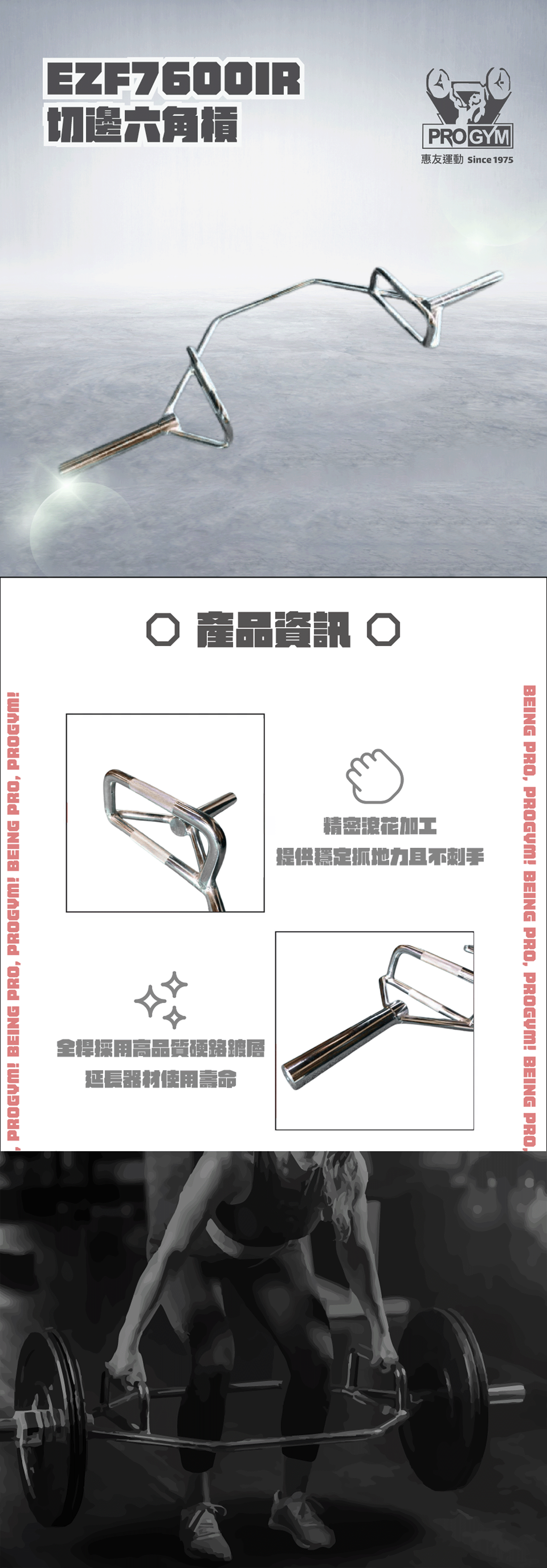 -三角形加固抓握區: 握把處採用穩固的三角形構造設計,提供極佳的結構剛性,確保大重量硬舉時槓身不產生扭曲晃動。